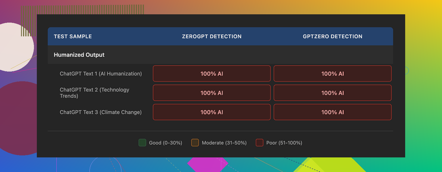 • Every single output still showed 100 percent AI on GPTZero and ZeroGPT.